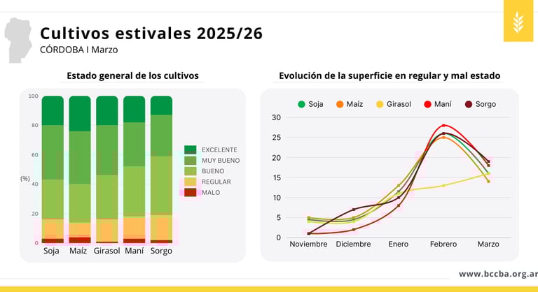 Foto de la Bolsa de Cereales de Córdoba con el estado de los cultivos, donde aproximadamente un 20% de los campos de maní se encuentran en un estado de Regular a Malo. En el siguiente link puede encontrar el informe: